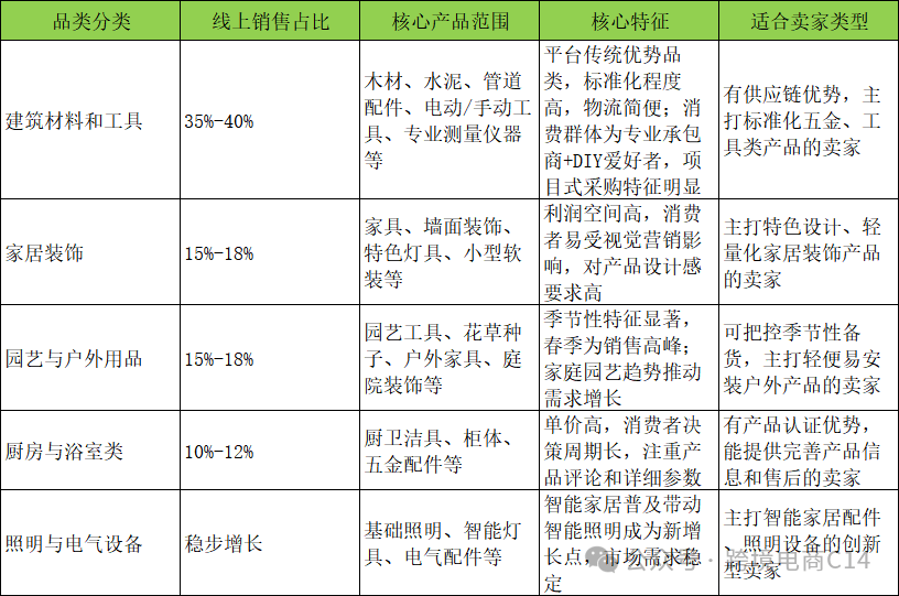Lowe’s已脱节单一线下卖场定位,全力打制全渠道零售体验,持续升级网坐和挪动使用,上线“正在线采办、店内提货”“送货上门”等办事,线上消费的便利性持续提拔。这一转型成效显著,2024年财据显示,其线%,线上发卖额占总发卖额的比例也正在持续攀升。从平台焦点劣势来看,Lowe’s正在专业建建材料和东西范畴深耕多年,构成了差同化合作力,这类用户不只客单价高,品牌和平台忠实度也极强,为相关品类卖家奠基了不变的客户根本。目前,Lowe’s正进一步扩充产物线,将高利润、特色化的家居粉饰、园艺品类做为沉点结构标的目的,为跨境卖家带来了新的切入机遇。Lowe’s2025年线上发卖类目分化较着,既有占领半壁山河的焦点劣势品类,也有增加势头强劲的潜力品类,分歧品类的市场特征和发卖占比各有差别,卖家可按照本身劣势精准选择,以下为焦点品类数据取特征阐发: